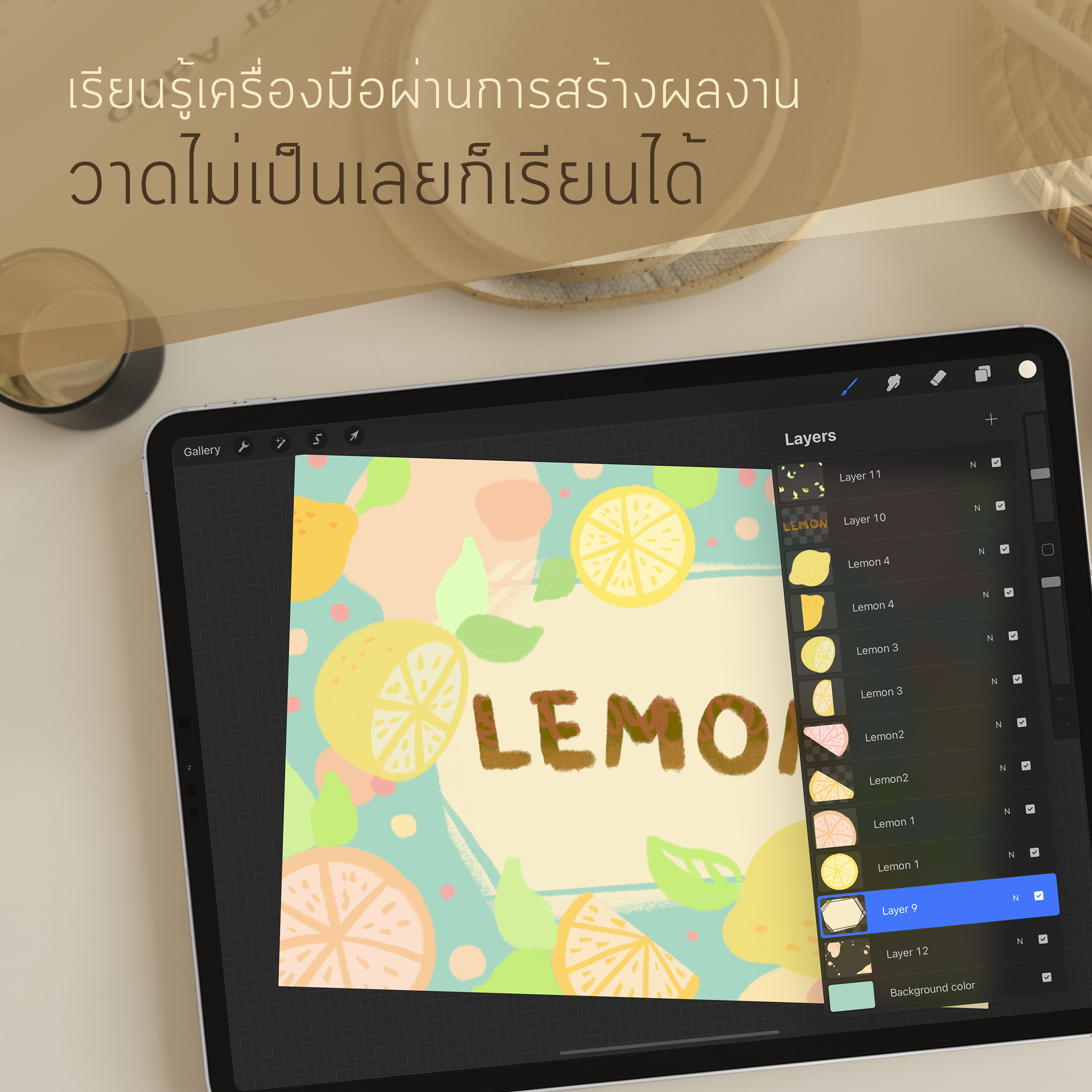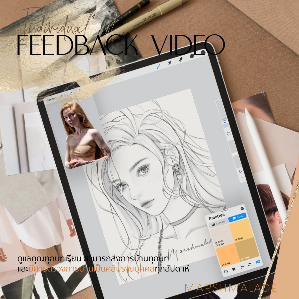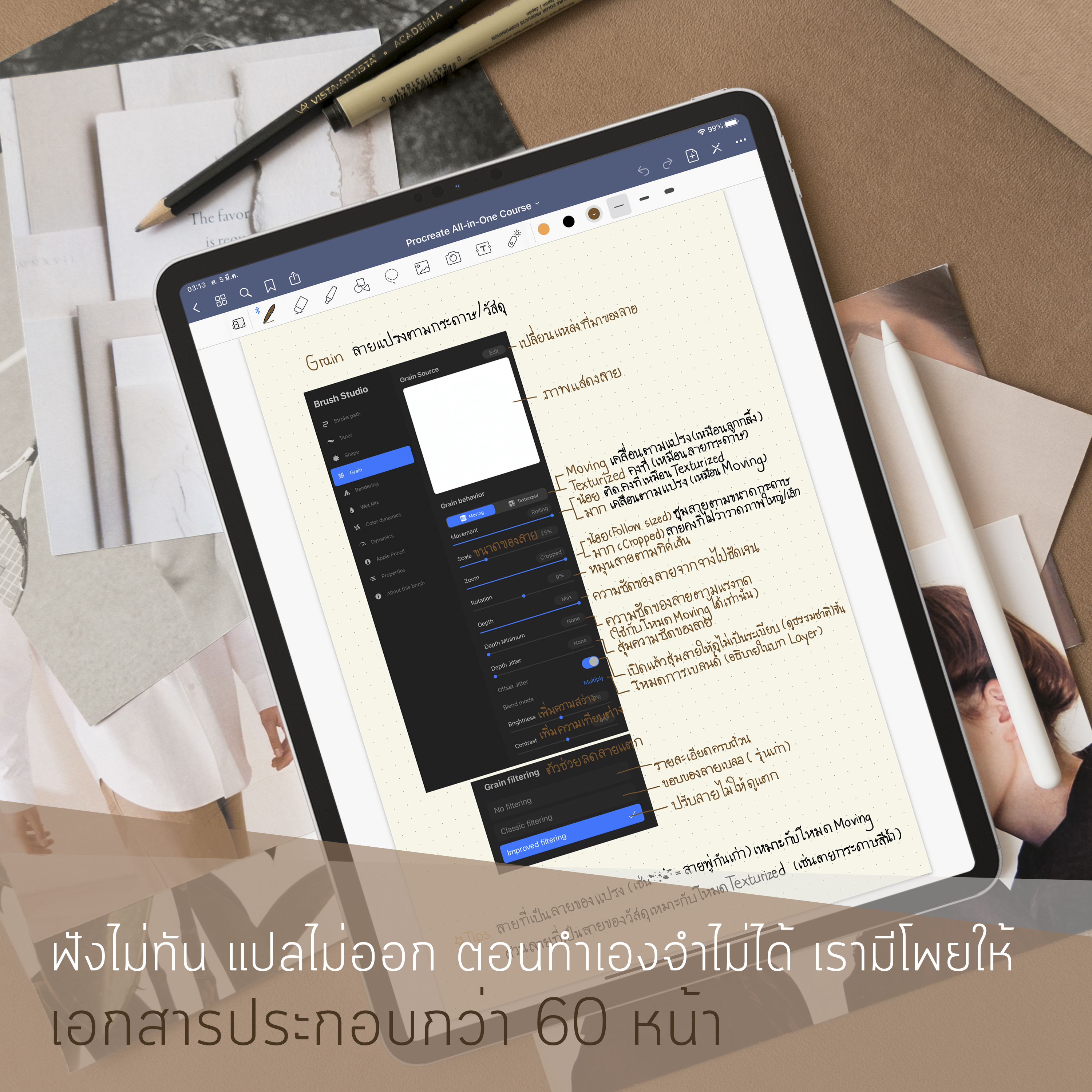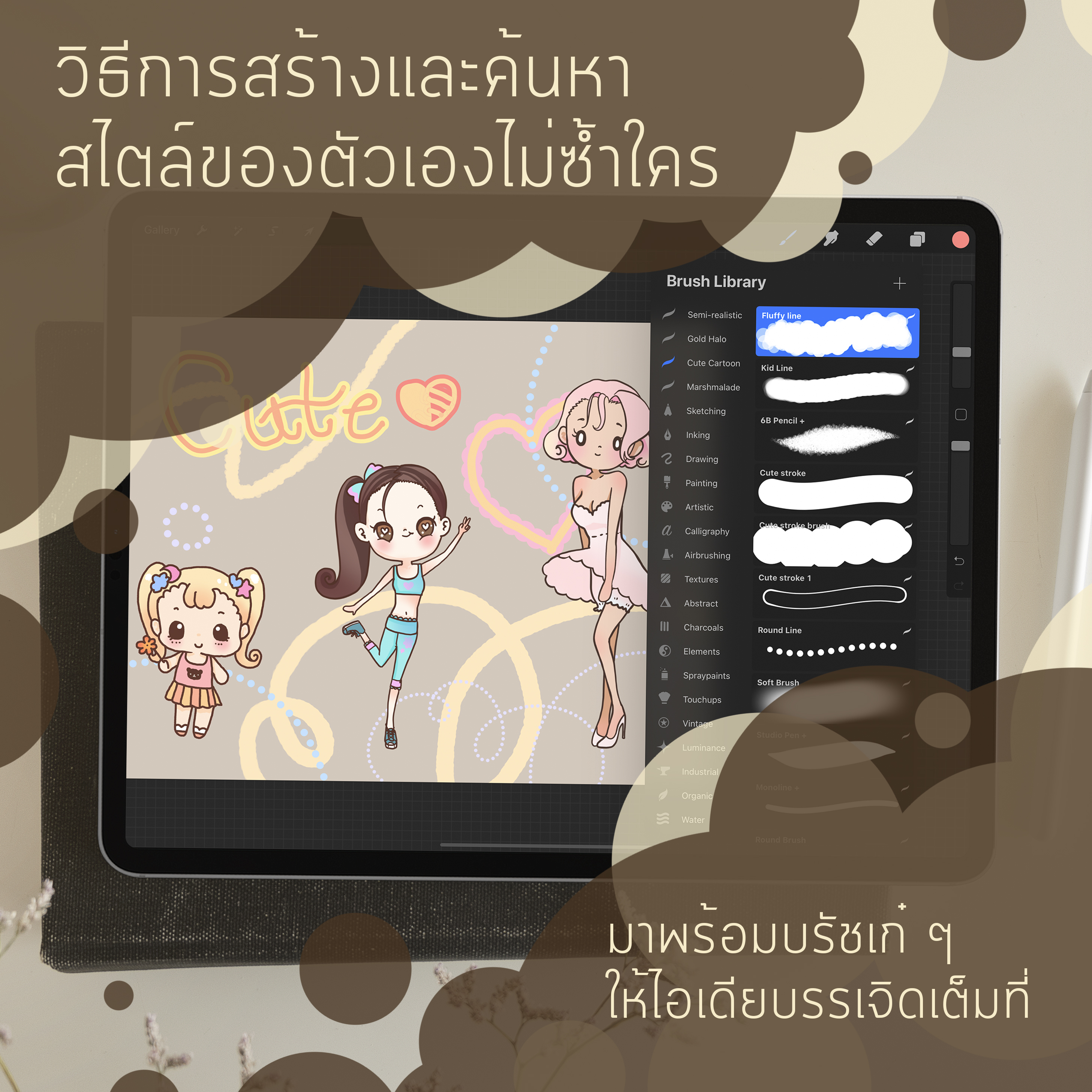 สามารถเลือกอุปกรณ์ที่เรียนได้อิสระ (ไม่มีสอนการใช้งานอุปกรณ์) มีเอกสารประกอบการเรียน และแถมบรัชที่เราใช้งานเองใน Procreate ฟรีค่ะ