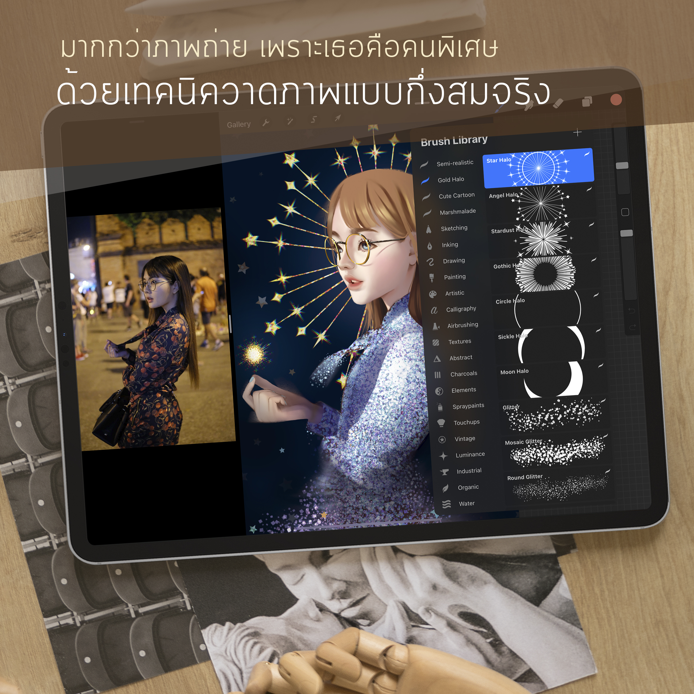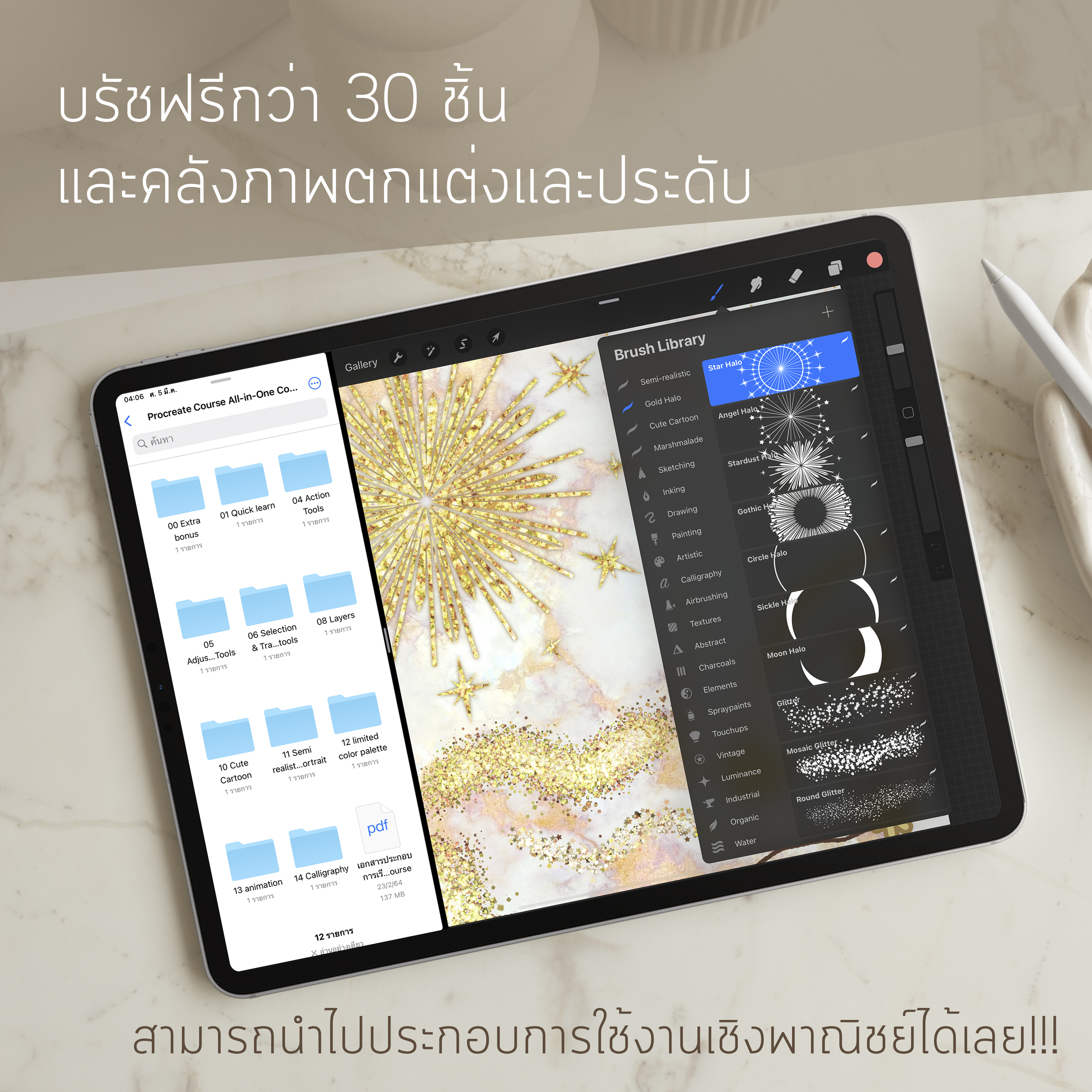 ในคอร์สมีเซ็ตบรัชมูลค่ากว่า 1,000 บาท แถมฟรี 3 เซ็ต รวมถึงไฟล์ภาพถ่ายประกอบการวาด และภาพสำหรับจัดองค์ประกอบต่าง ๆ ให้ผู้เรียนได้ใช้งานเชิงพาณิชย์ได้ฟรี